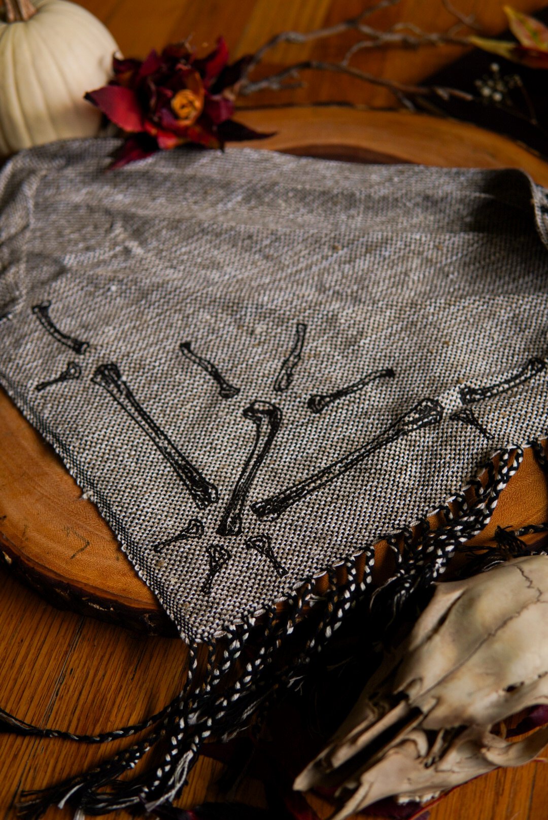 This kerchief has been handwoven on a Saori loom using cotton and linen threads. The piece has been printed with our custom bone linocuts in a unique pattern. Soft and versatile, this piece is one of a kind with a thick braided fringe.