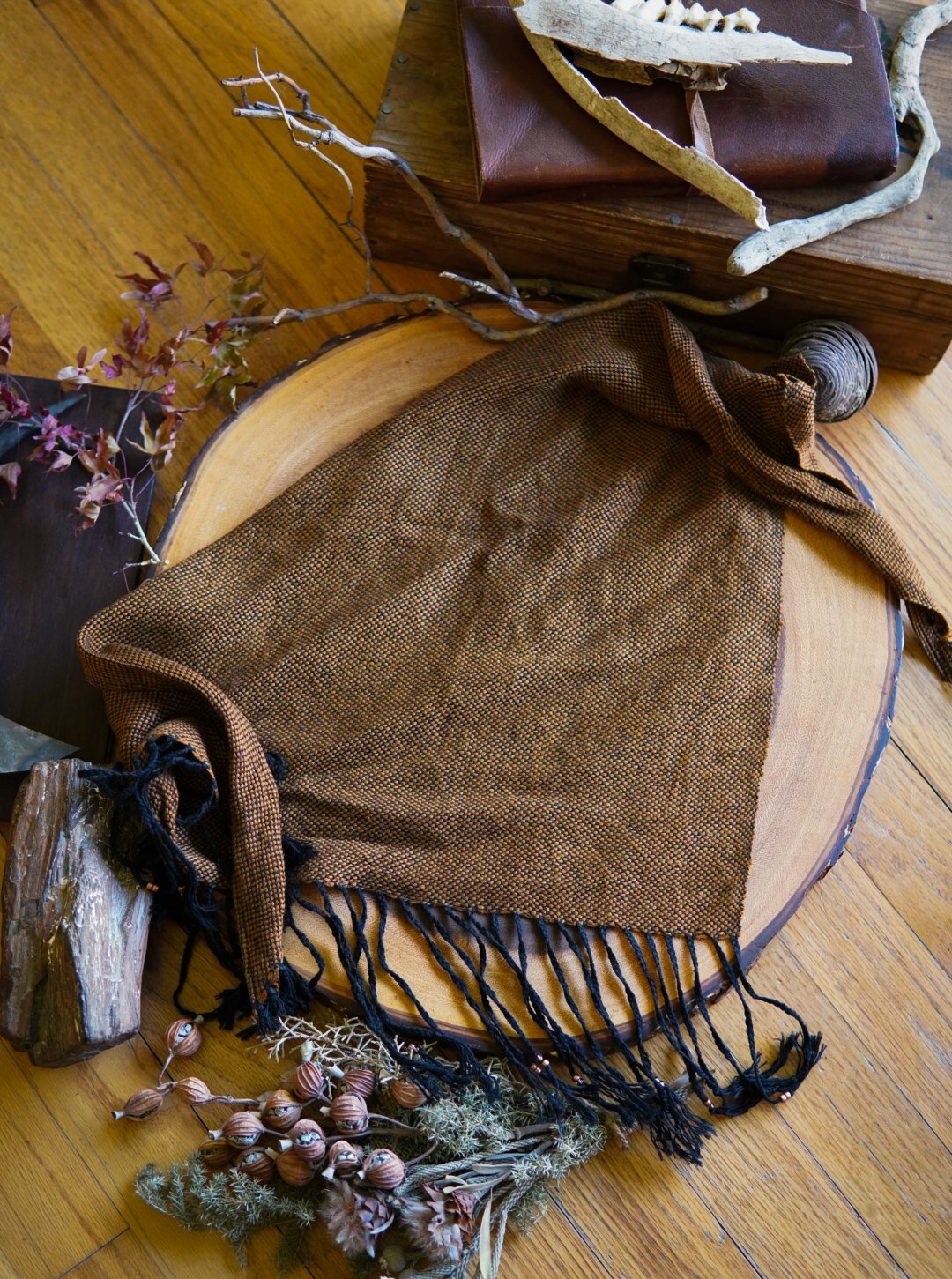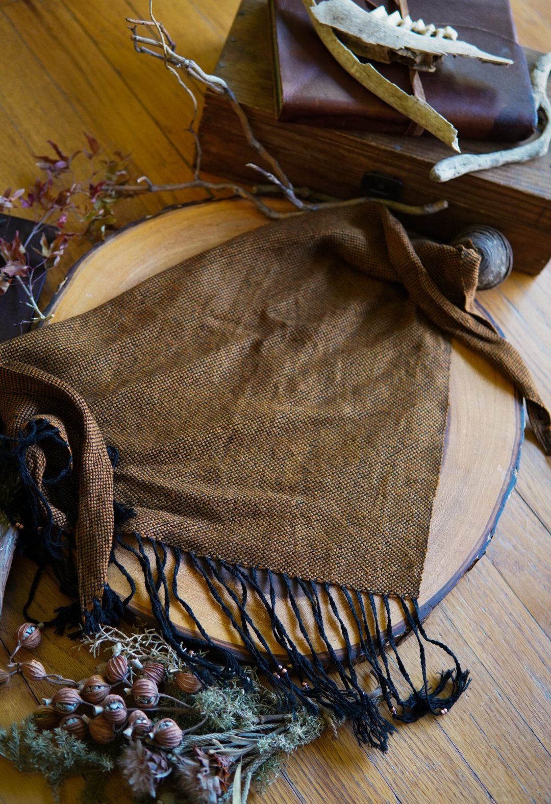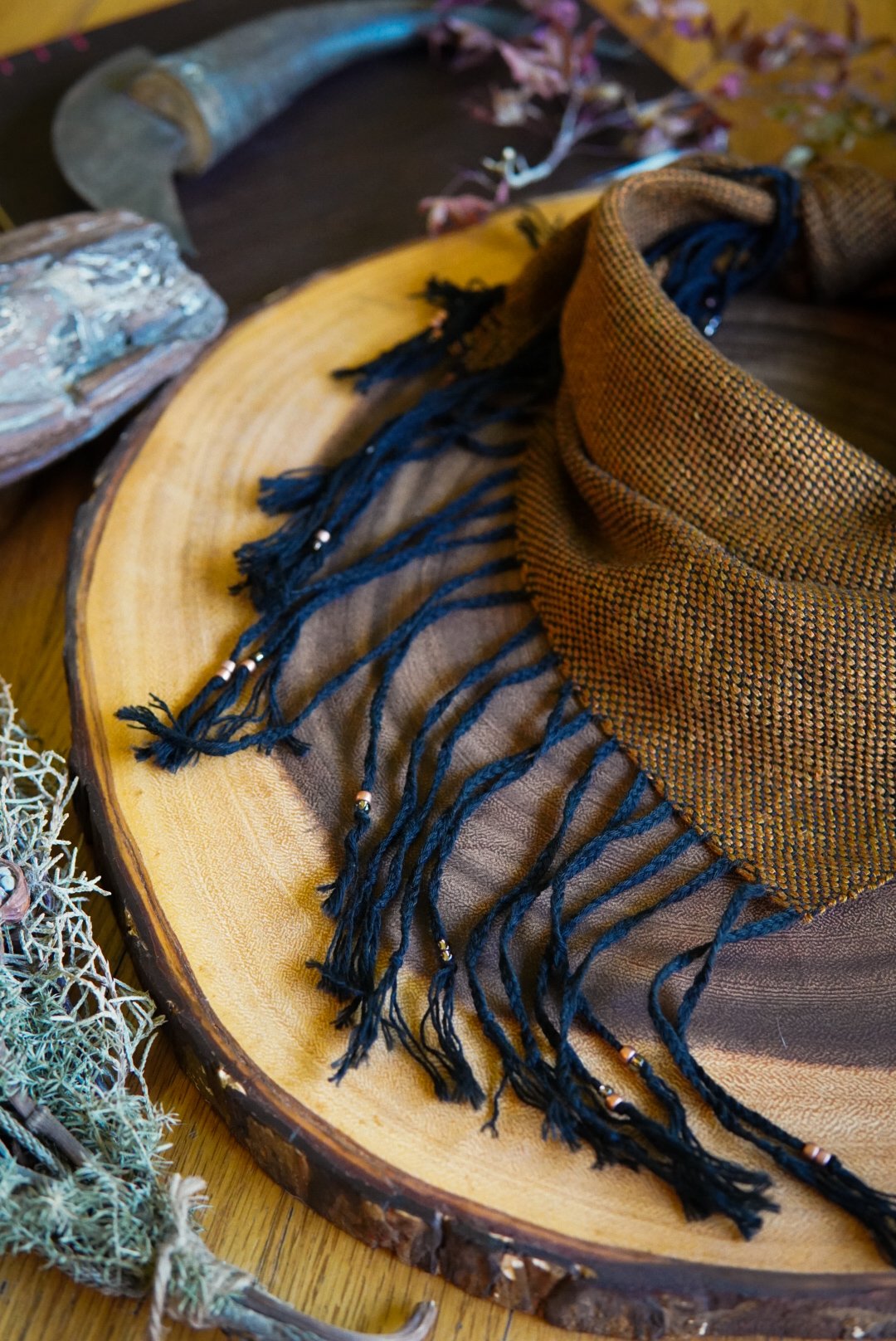 This kerchief has been handwoven on a Saori loom using cotton and bamboo threads. Soft and versatile, this piece is one of a kind with a beaded and braided fringe.