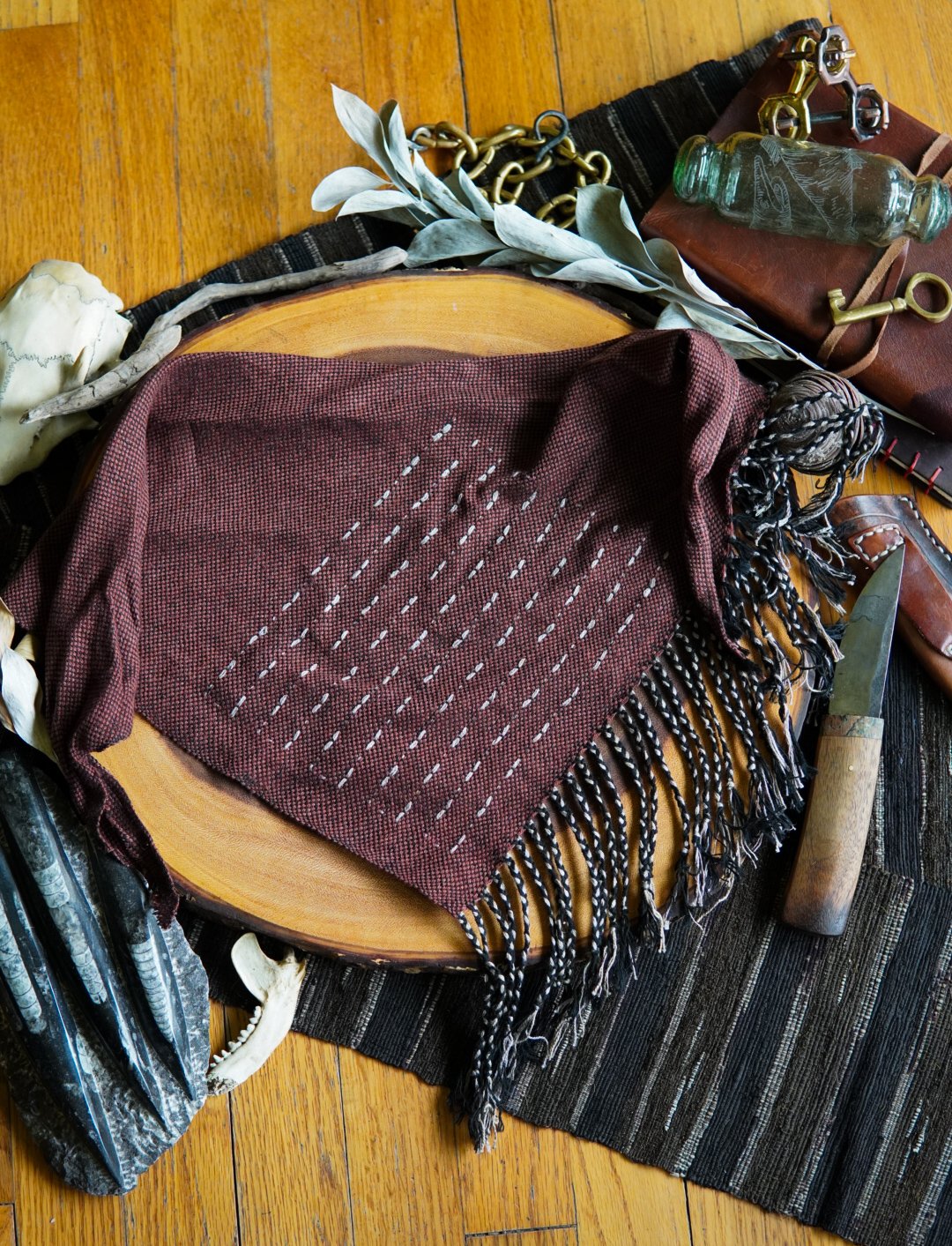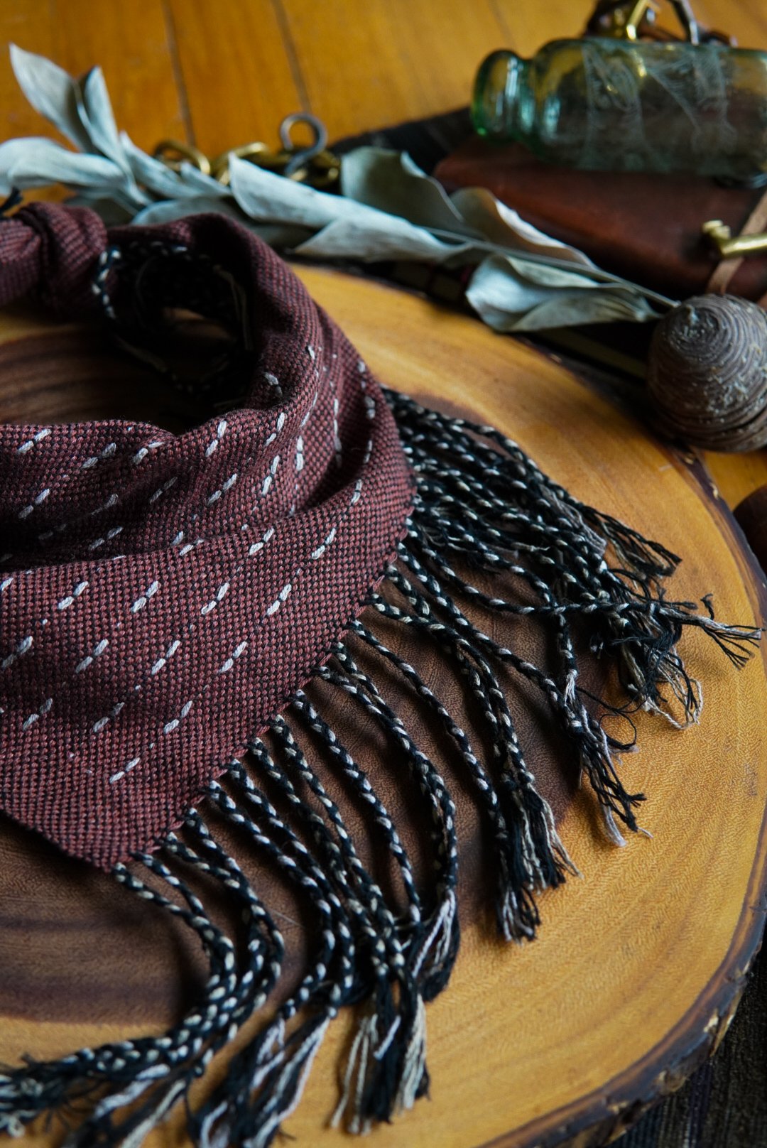 This kerchief has been handwoven on a Saori loom using cotton and linen threads in the style of Sashiori. Soft and versatile, this piece is one of a kind with a thick braided fringe.