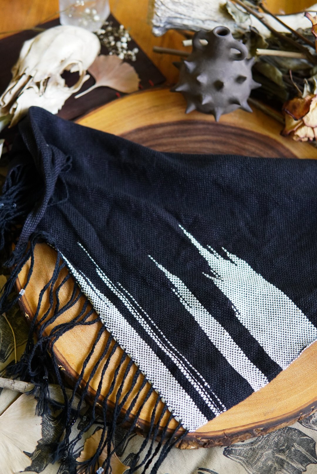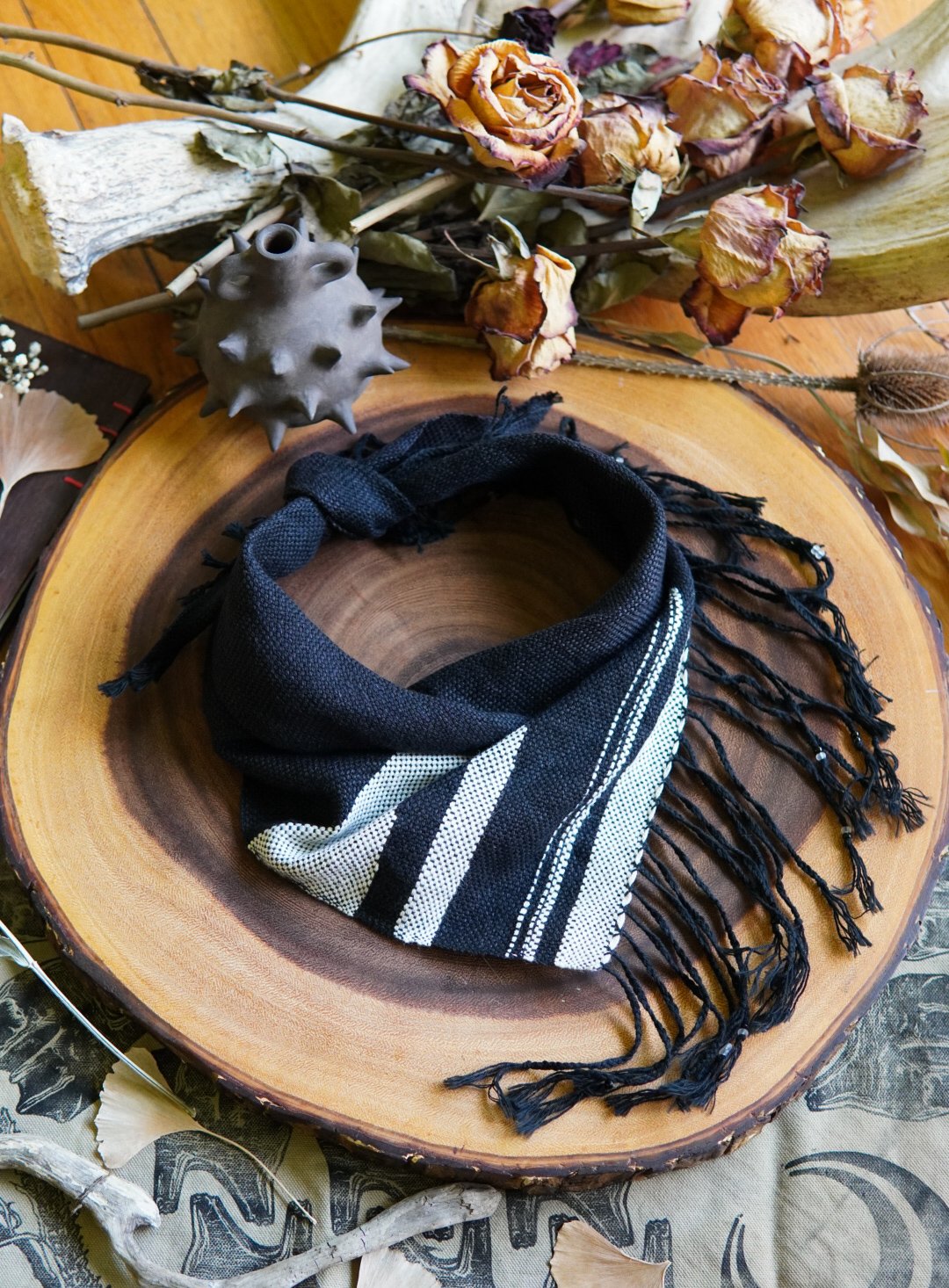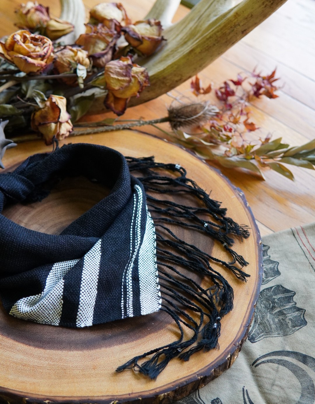 This kerchief has been handwoven on a Saori loom using cotton and linen threads using the clasped weft technique. Soft and versatile, this piece is one of a kind with a braided and beaded fringe.