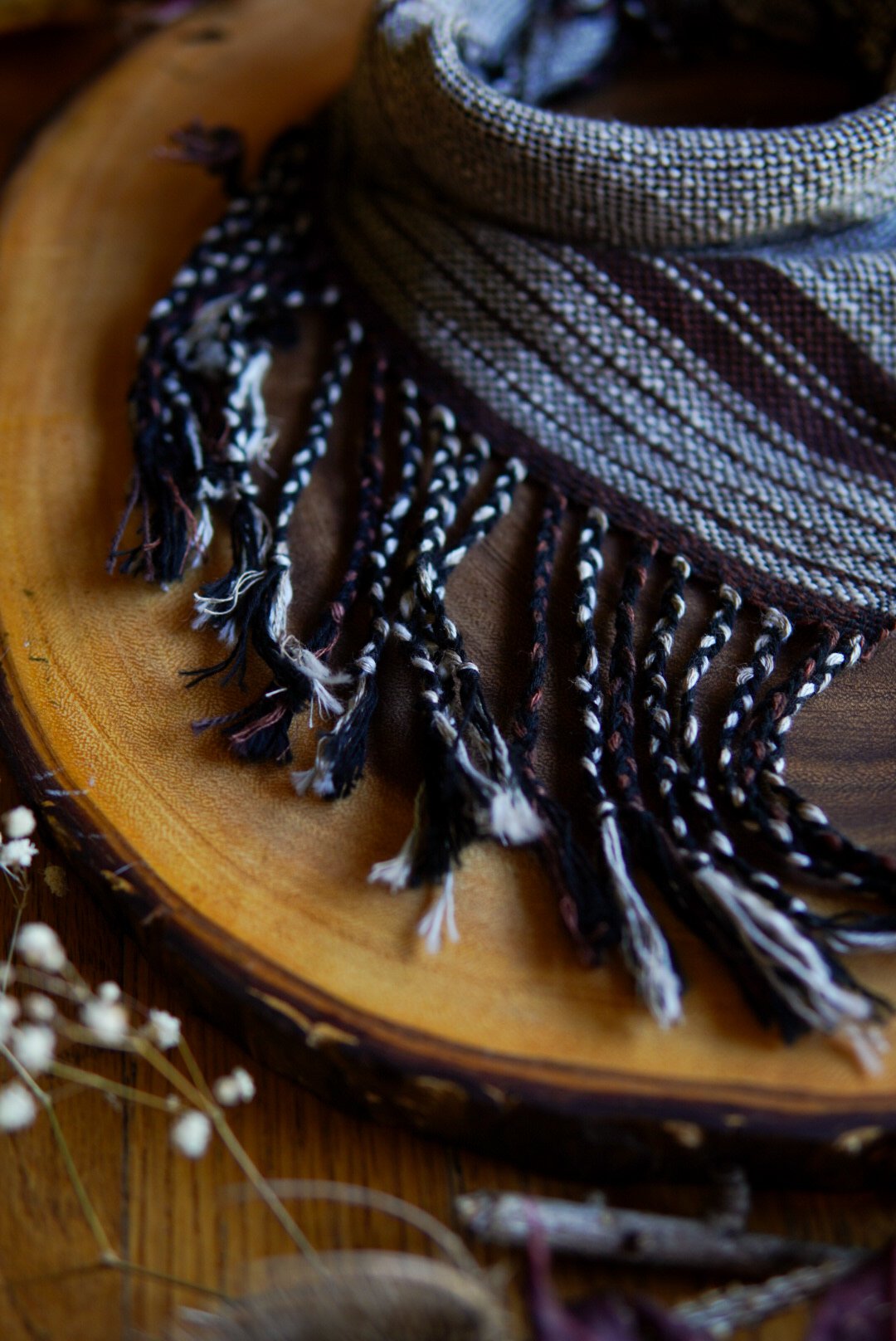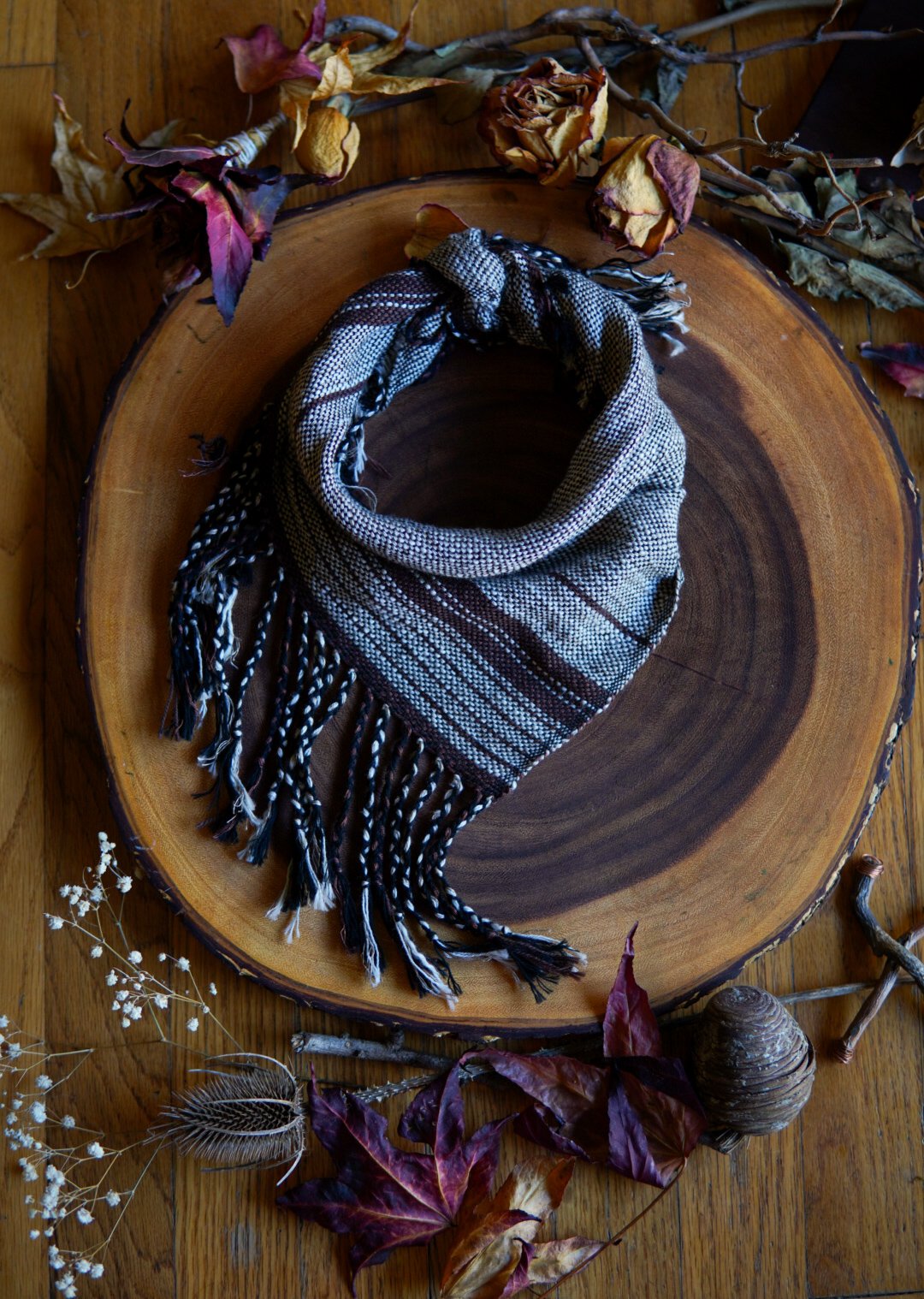 This kerchief has been handwoven on a Saori loom using cotton and linen threads. Soft and versatile, this piece is one of a kind with a thick braided fringe.