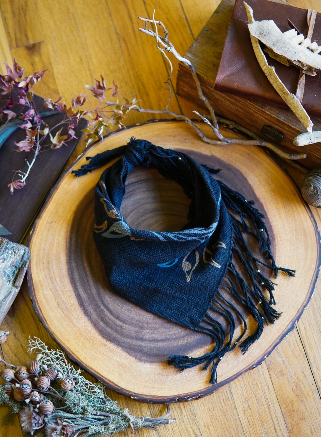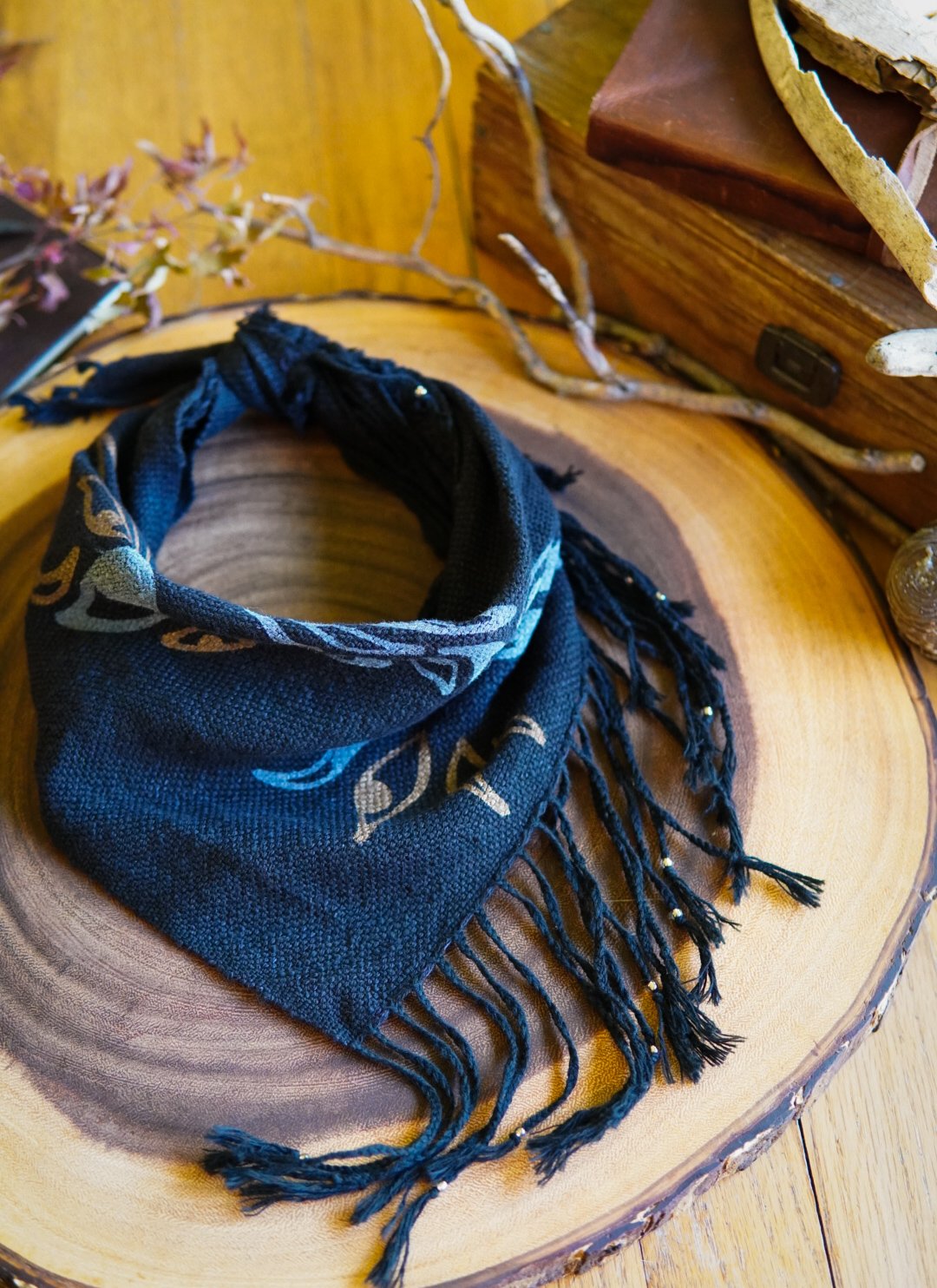This kerchief has been handwoven on a Saori loom using cotton and linen threads. Soft and versatile, this piece is one of a kind with a beaded and braided fringe.