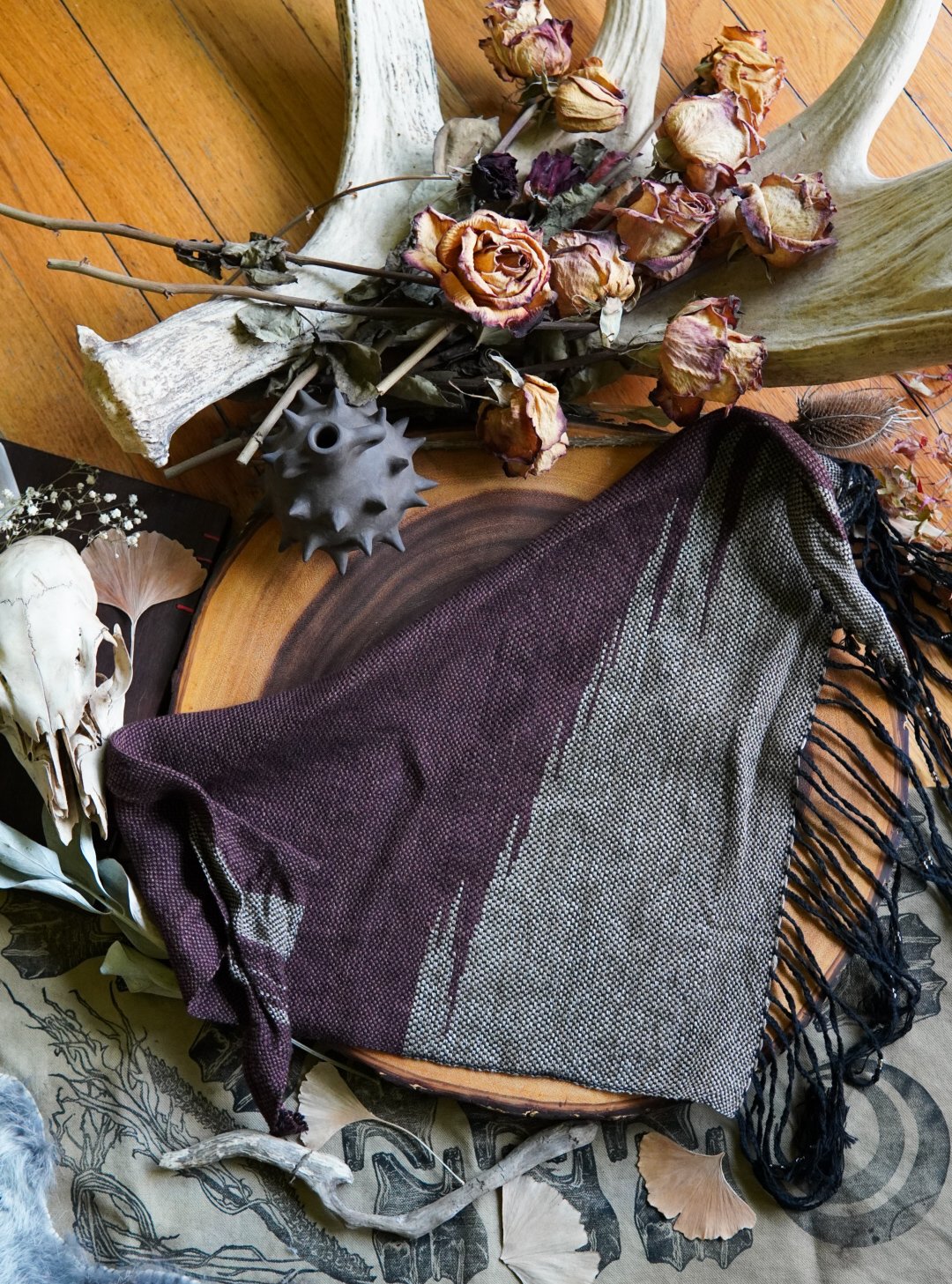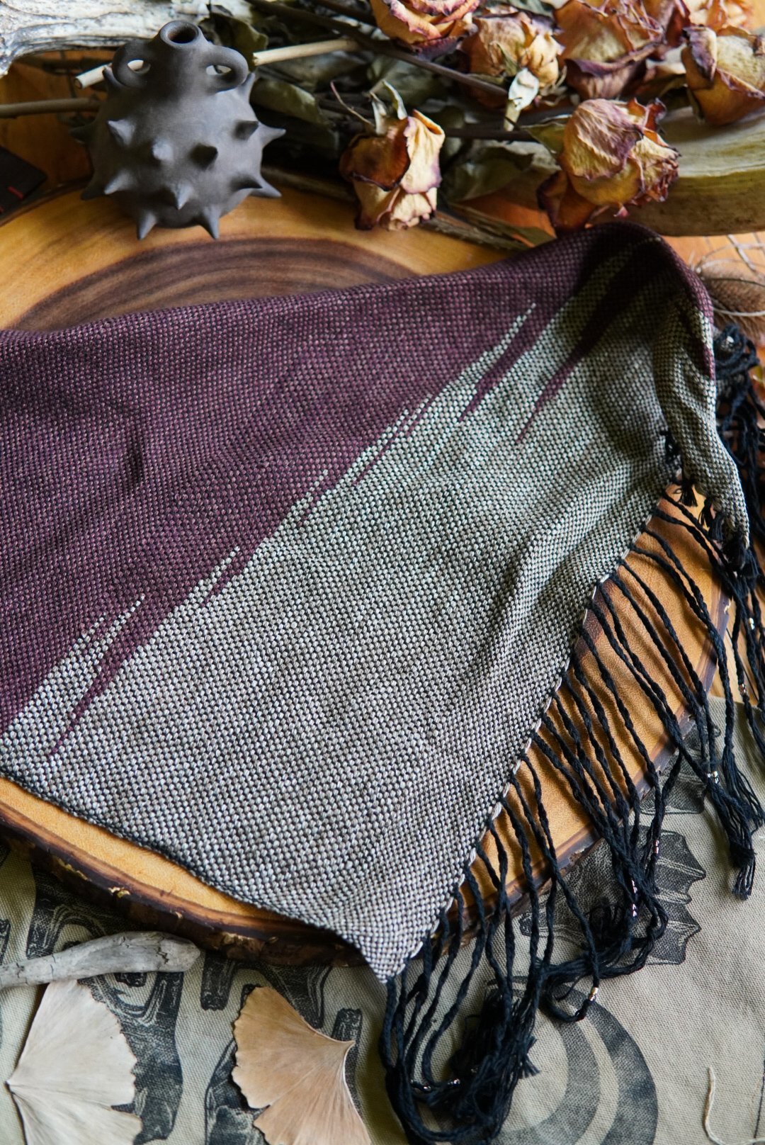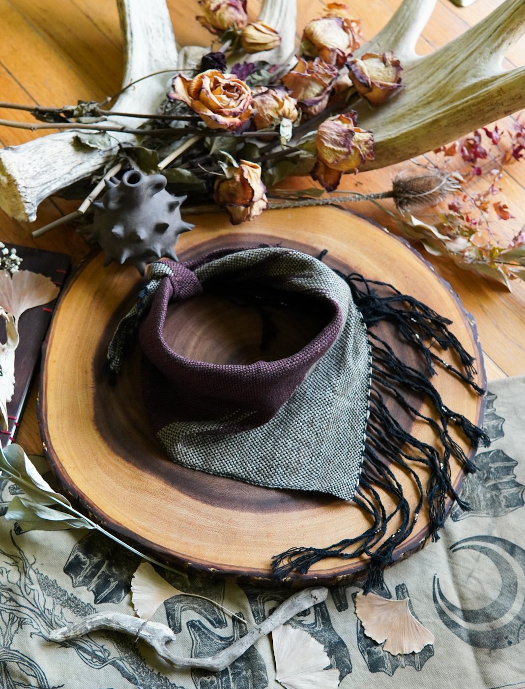 This kerchief has been handwoven on a Saori loom using cotton and linen threads using the clasped weft technique. Soft and versatile, this piece is one of a kind with a braided and beaded fringe.