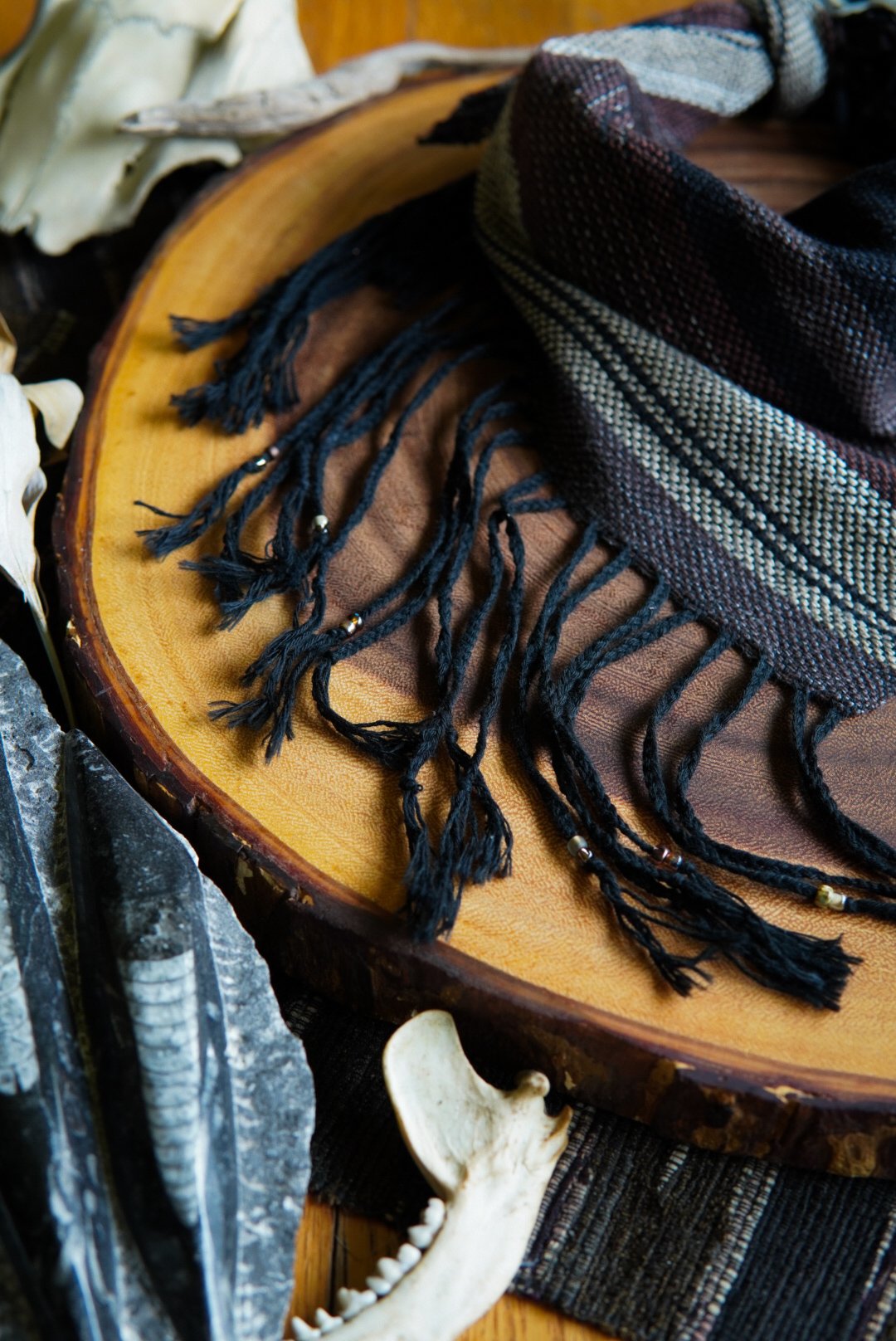 This kerchief has been handwoven on a Saori loom using cotton and linen threads. Soft and versatile, this piece is one of a kind with a beaded and braided fringe.