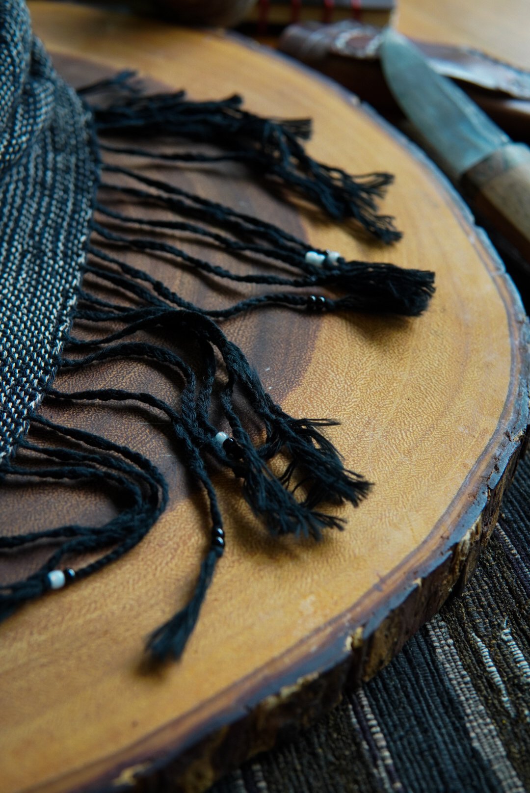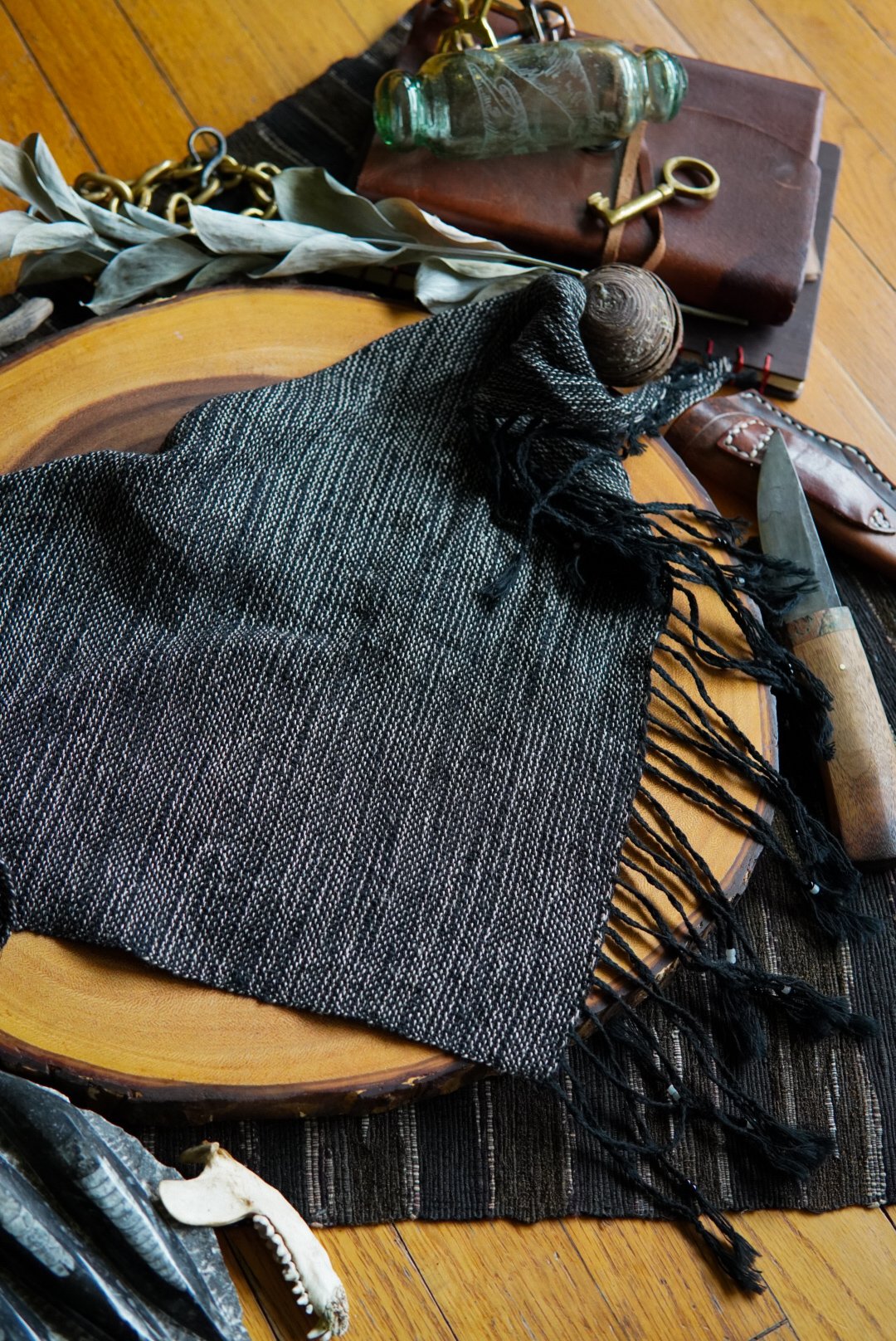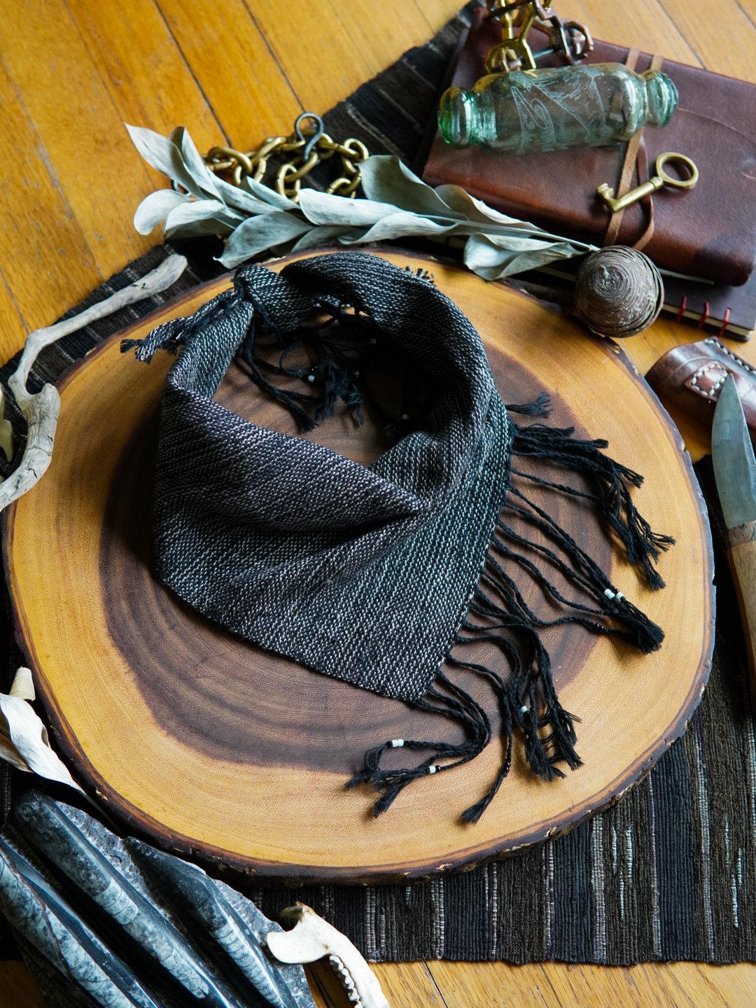 This kerchief has been handwoven on a Saori loom using cotton and linen threads. Soft and versatile, this piece is one of a kind with a beaded and braided fringe.