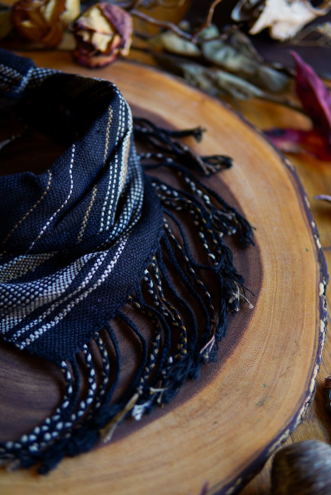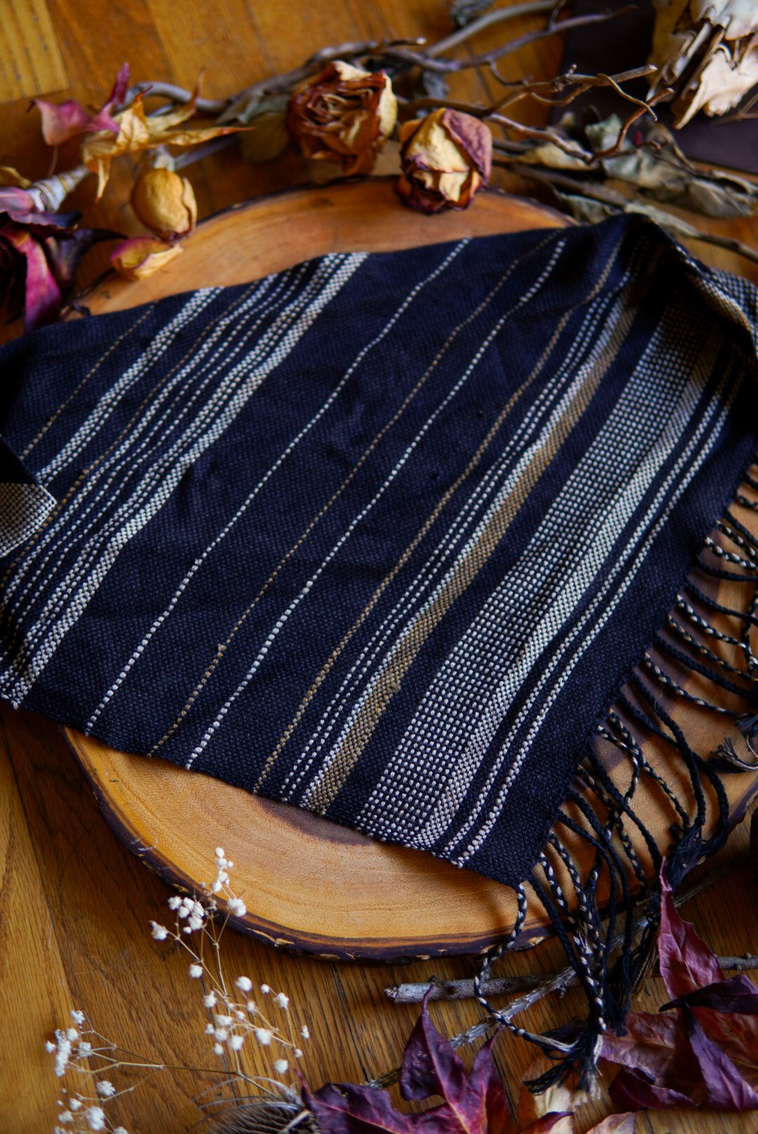This kerchief has been handwoven on a Saori loom using cotton and linen threads. Soft and versatile, this piece is one of a kind with a thick braided fringe.