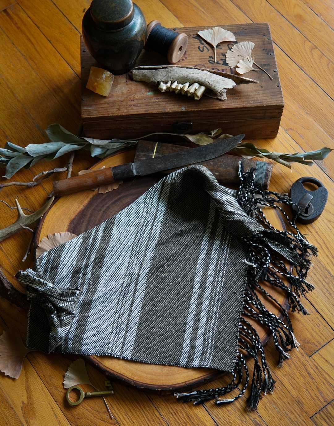 This kerchief has been handwoven on a Saori loom using cotton and linen threads. Soft and versatile, this piece is one of a kind with a thick braided fringe.