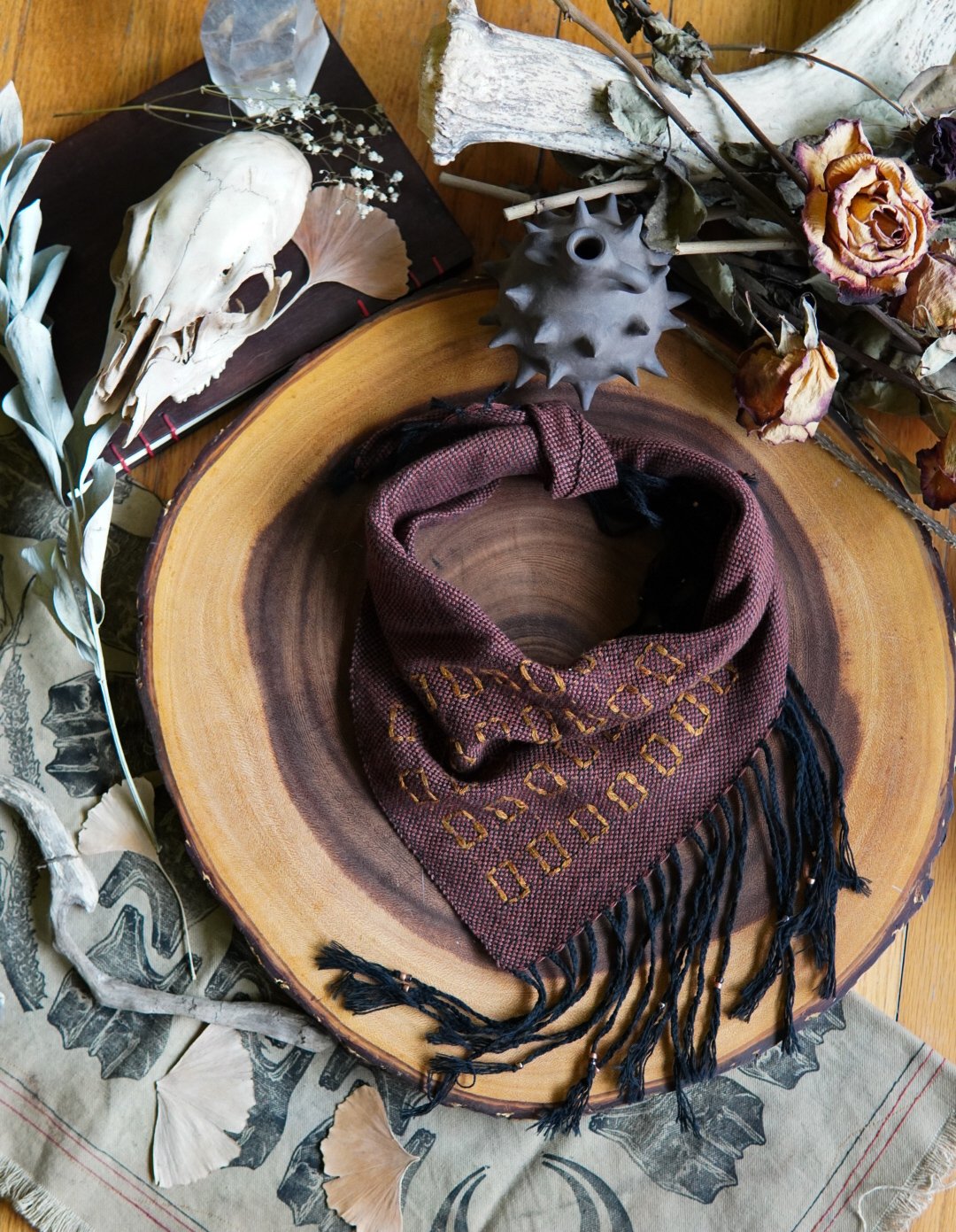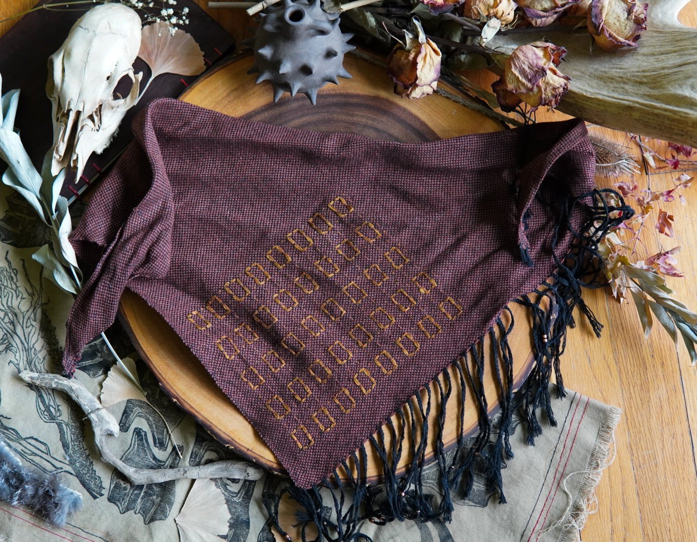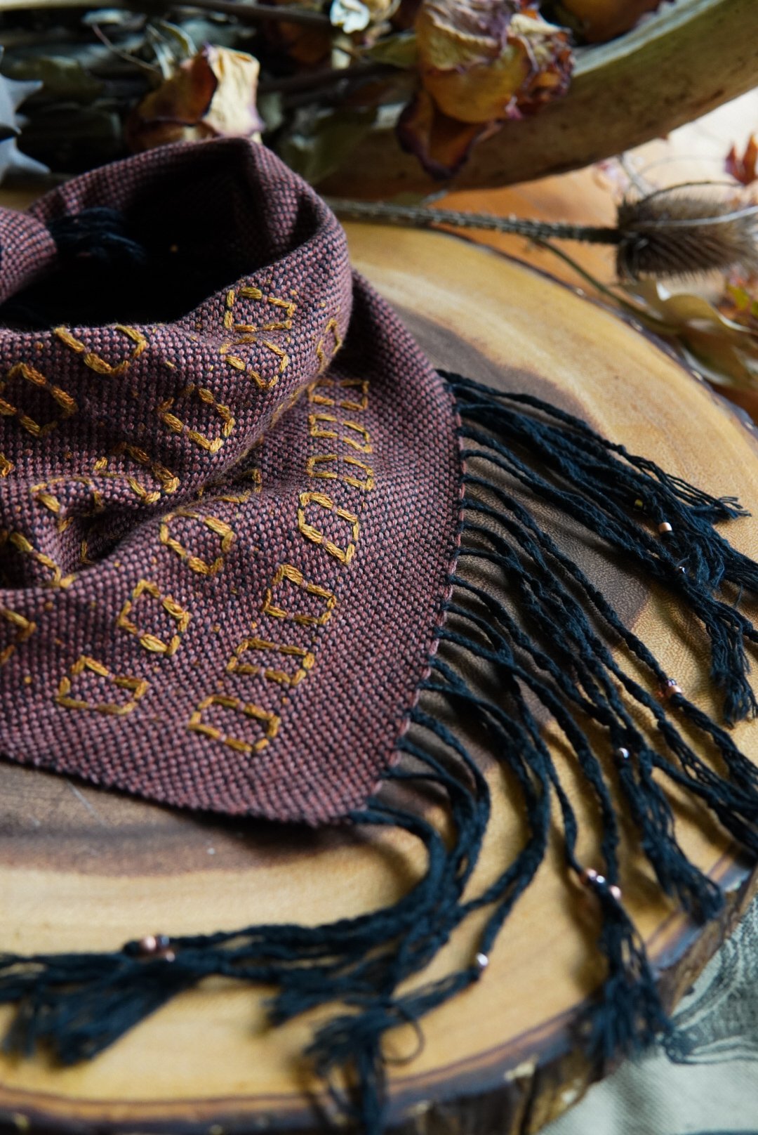 This kerchief has been handwoven on a Saori loom using cotton and linen threads. Soft and versatile, this piece is one of a kind with a braided and beaded fringe.