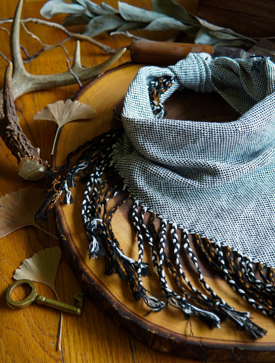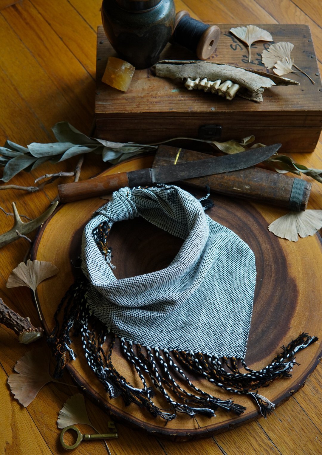 This kerchief has been handwoven on a Saori loom using cotton and linen threads. Soft and versatile, this piece is one of a kind with a thick braided fringe.
